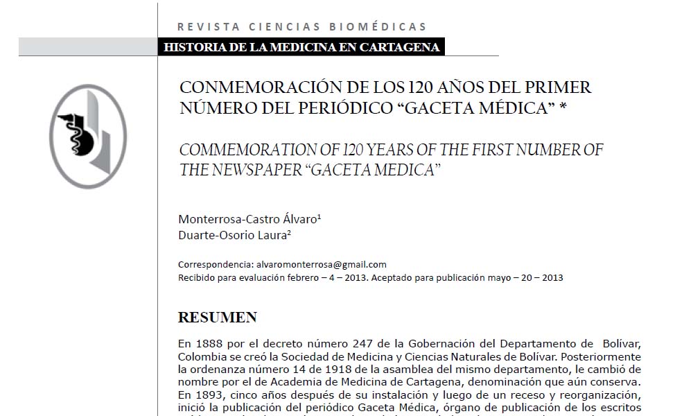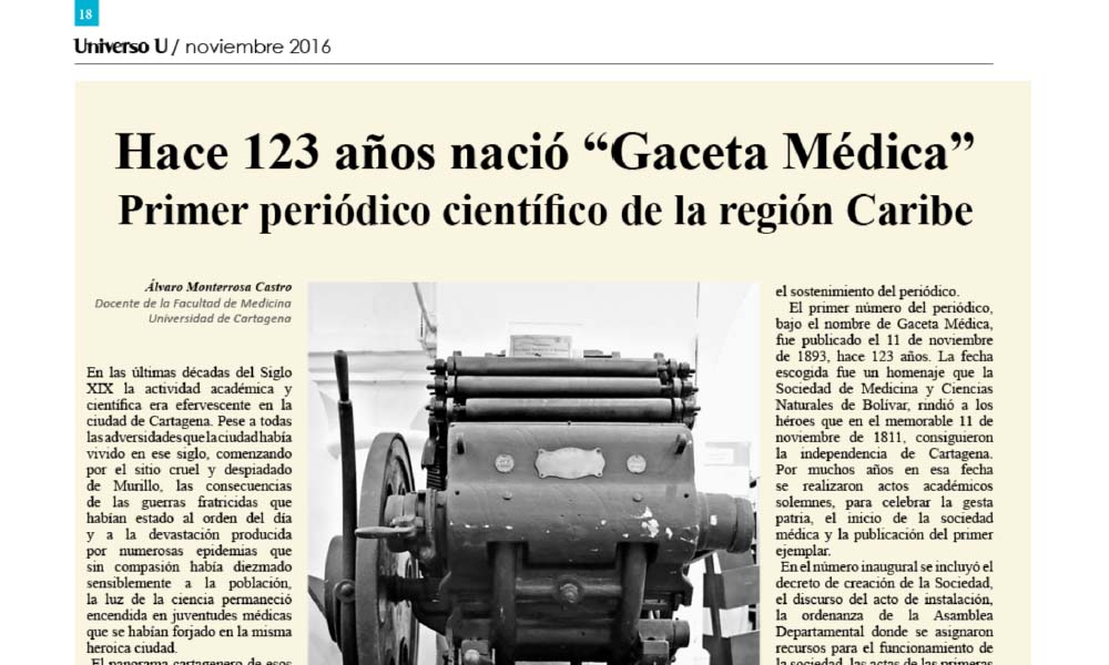 Hace 123 años nació "Gaceta Médica" primer periódico científico de la región Caribe