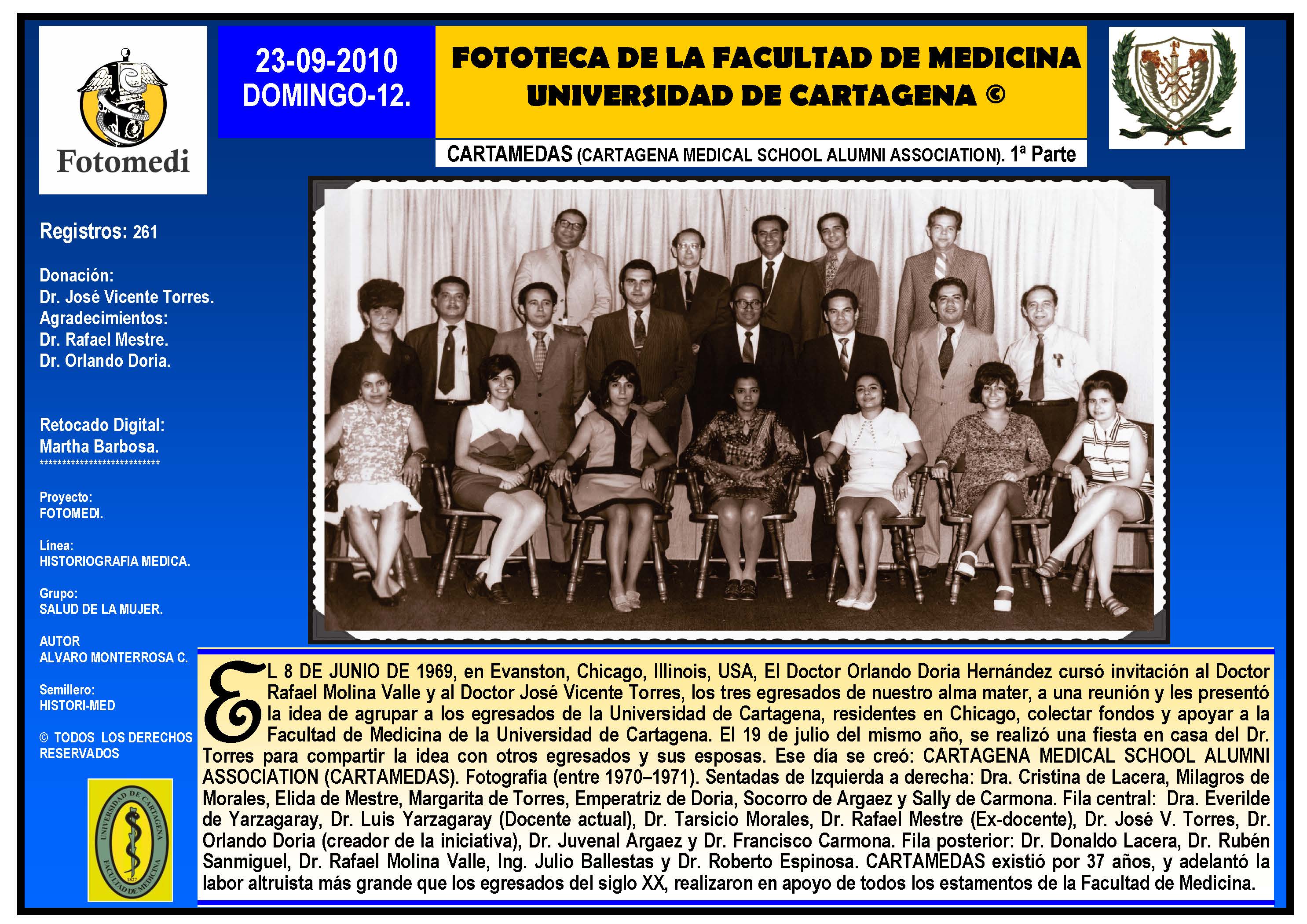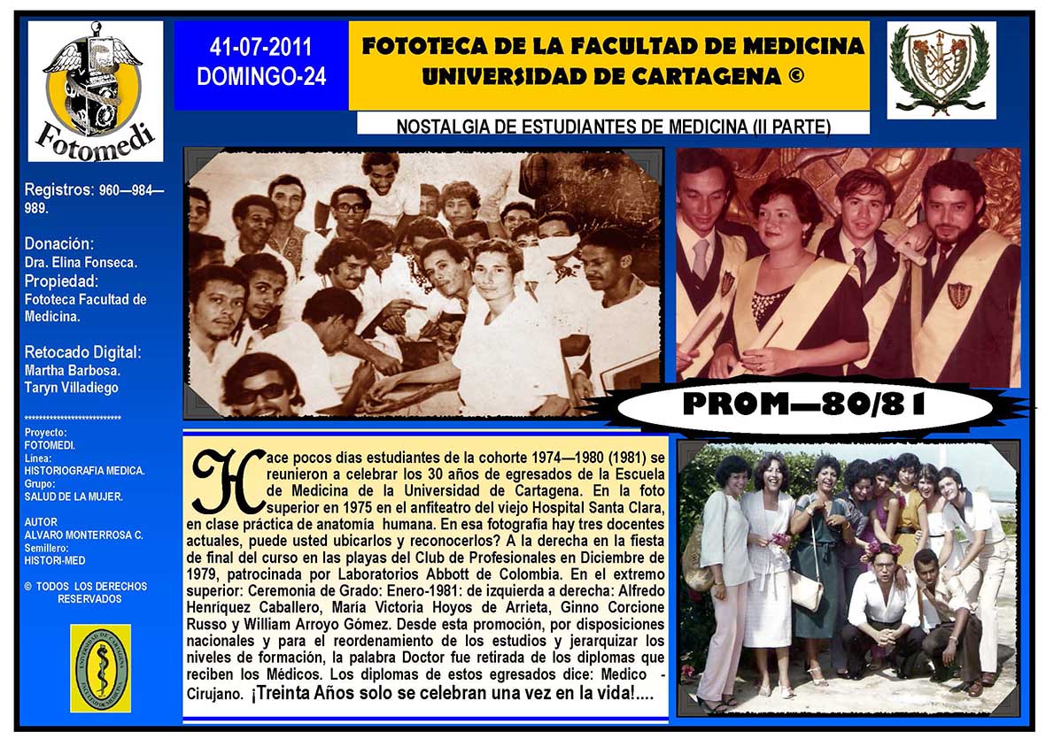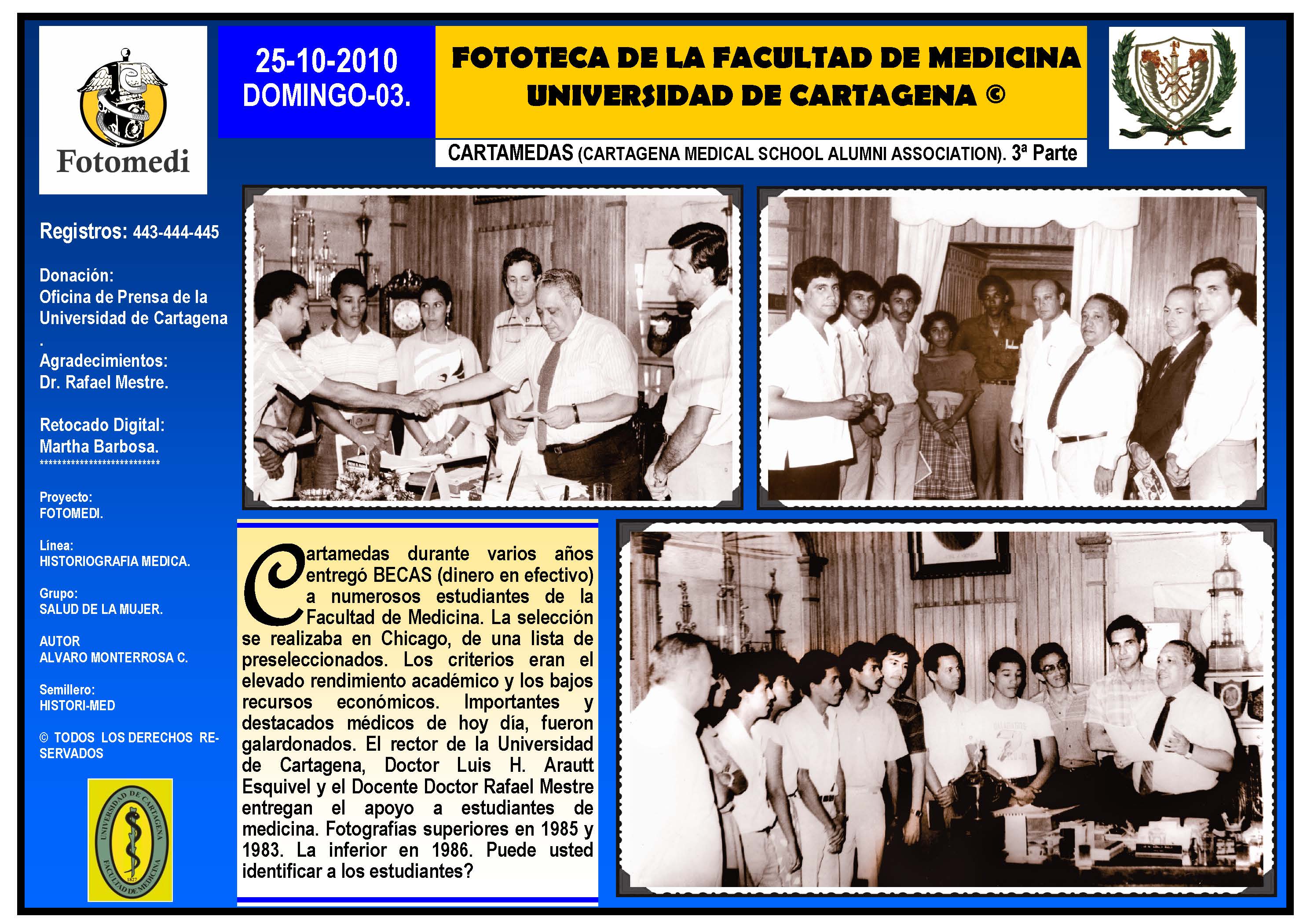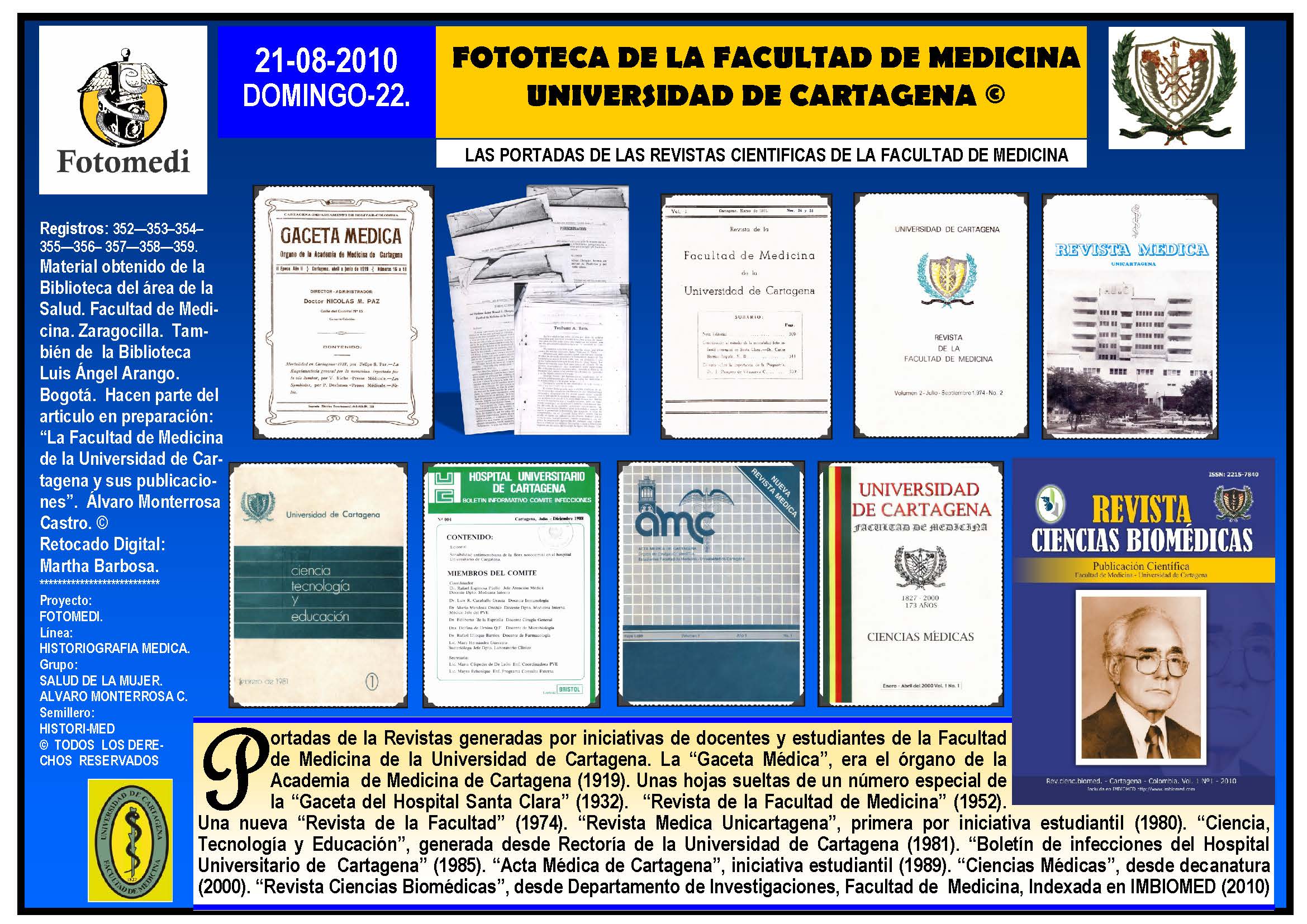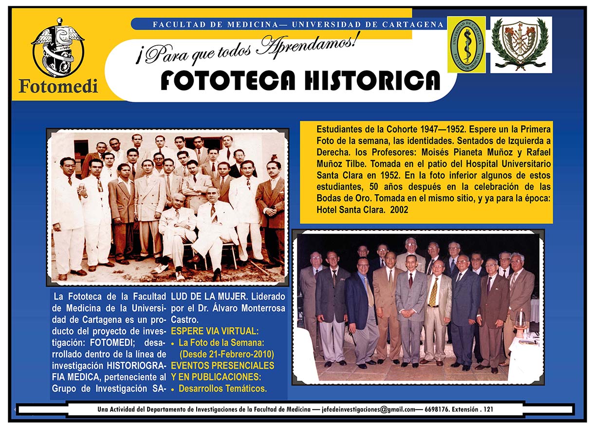 El proyecto FOTOMEDI se publicó en 55 entregas electrónicas por vía de email entre el 2010-2014 a profesionales médicos, egresados, administrativos y estudiantes de la Universidad de Cartagena, Colombia. Se presentaron más de 40 temáticas que abordaron aconteceres de la Escuela de Medicina de Dicha Universidad. El proyecto es periódicamente compartido completo o algunos de sus componente por redes sociales (Facebook, Instagram, Washapps y otras). Cada una de las entregas puede ser descargada libremente y compartida con fines estrictamente académicos, historiográficos o documentales, realizando la citación respectiva en cuanto a autorías y alojamiento en la web. No está autorizada la comercialización.