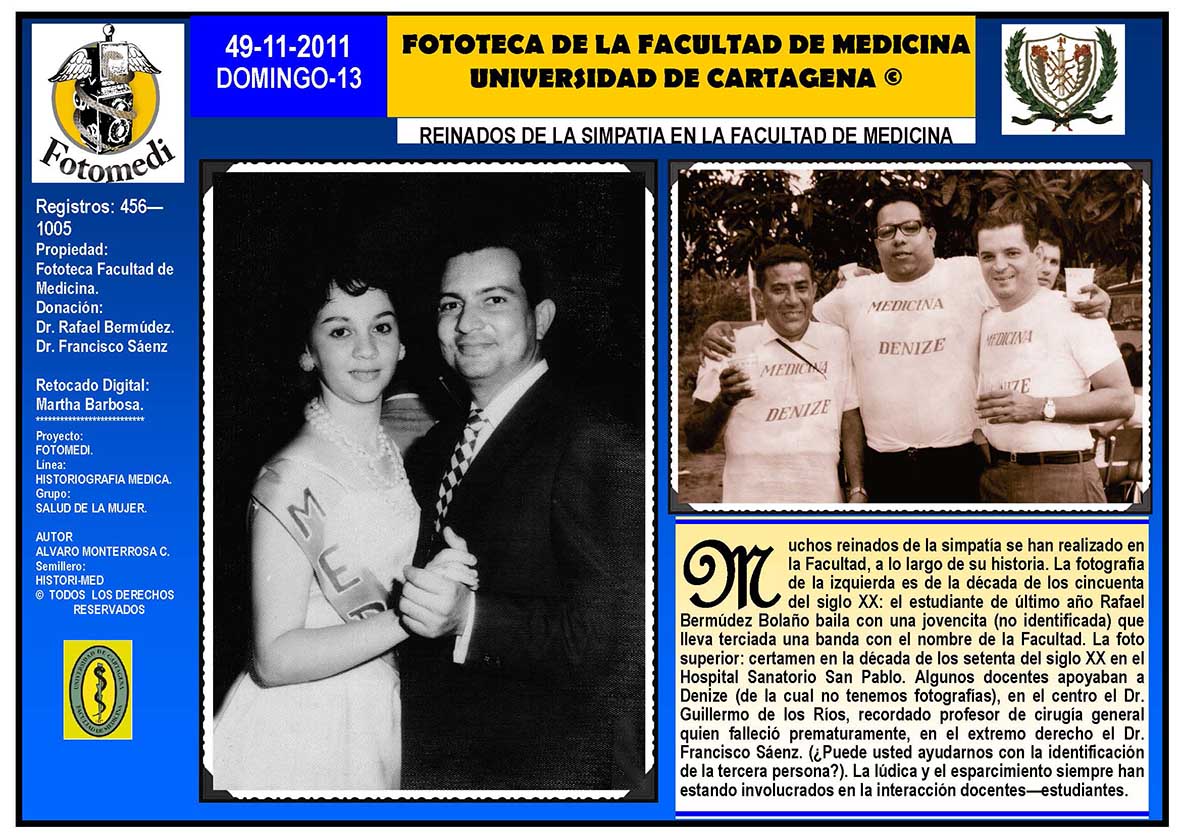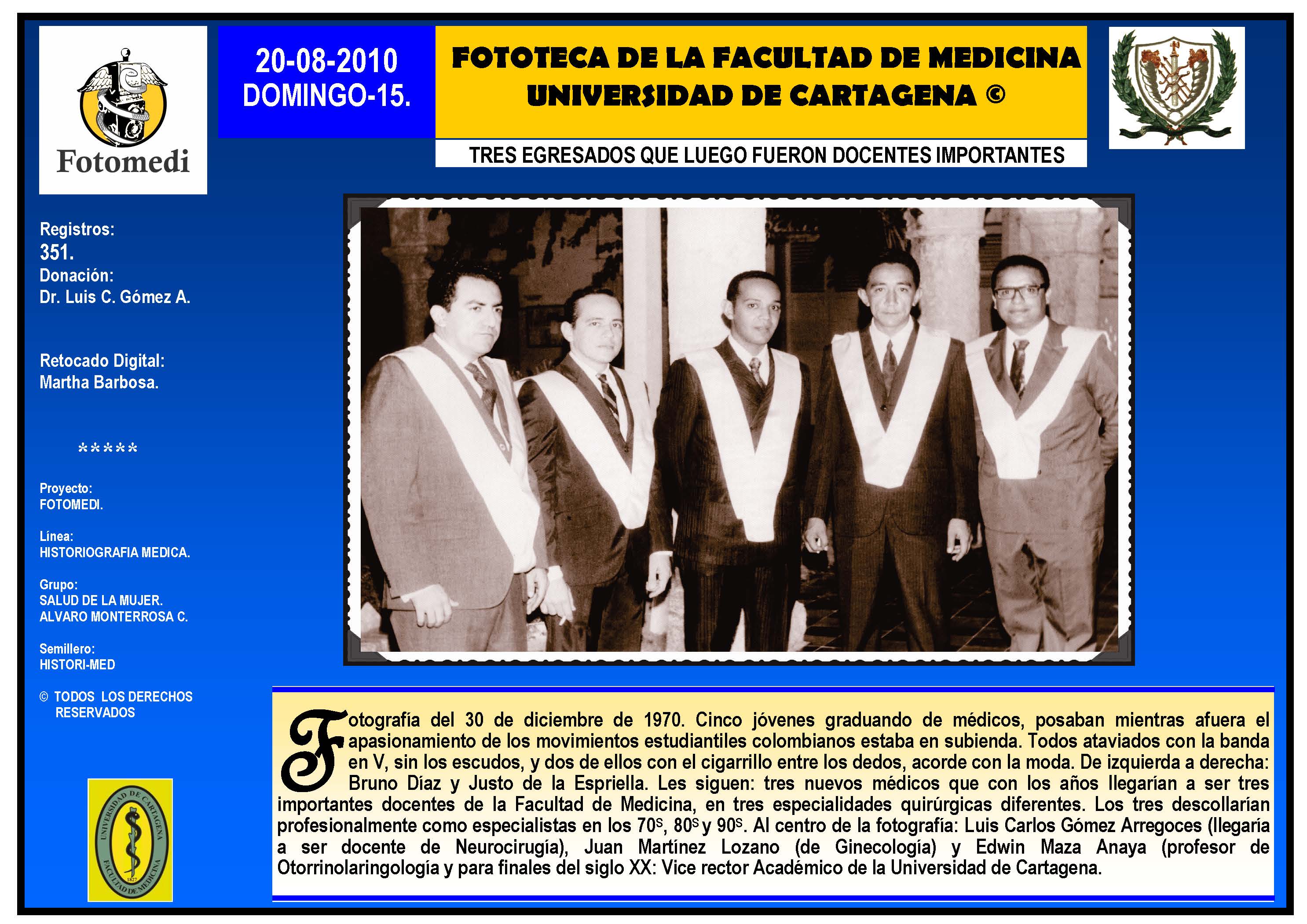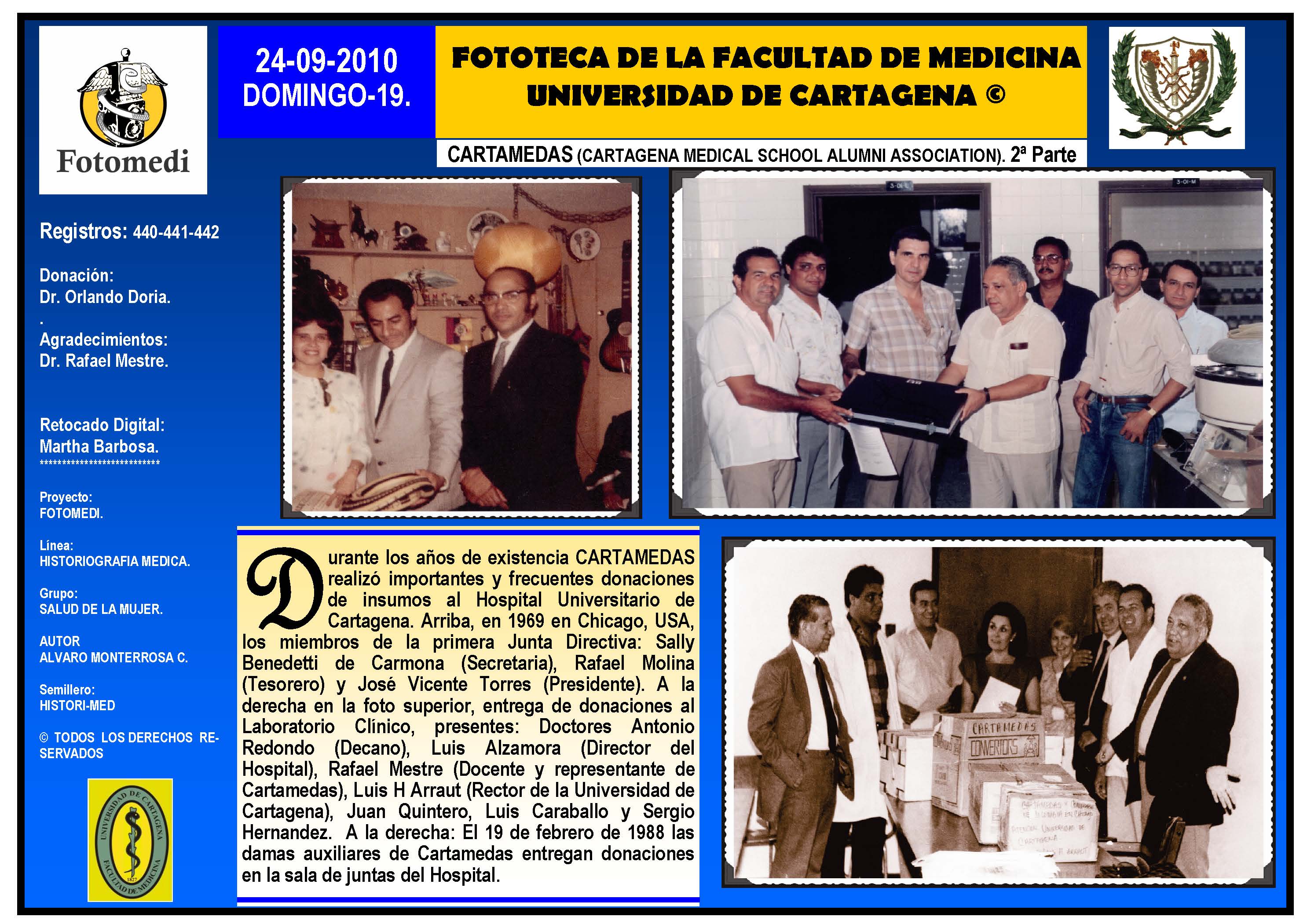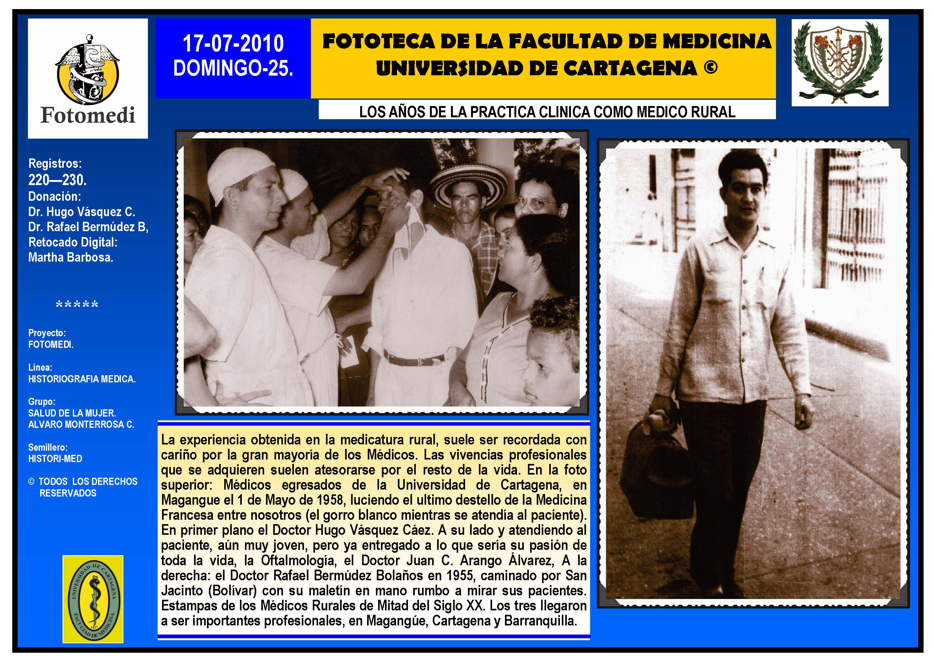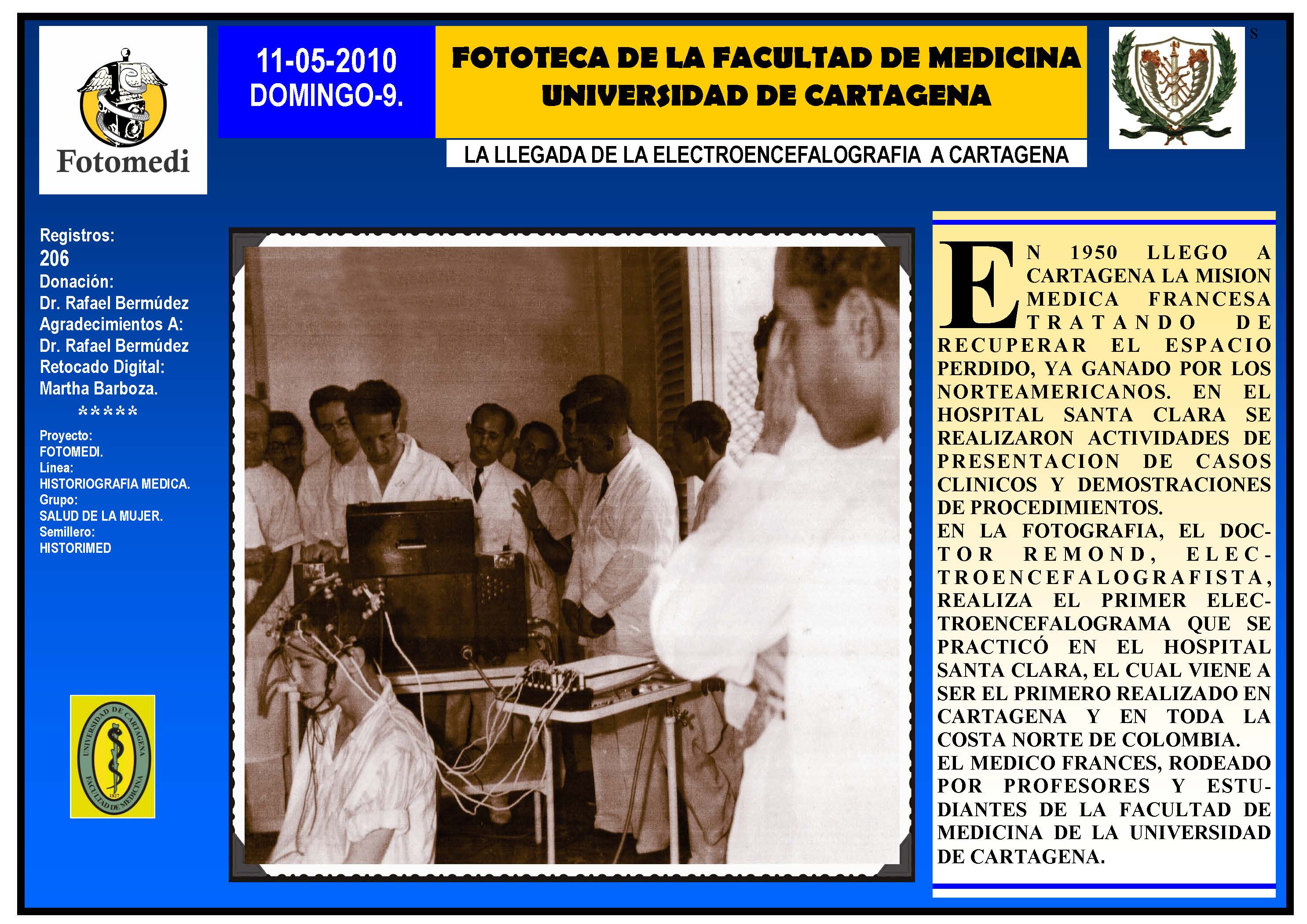 El proyecto FOTOMEDI se publicó en 55 entregas electrónicas por vía de email entre el 2010-2014 a profesionales médicos, egresados, administrativos y estudiantes de la Universidad de Cartagena, Colombia. Se presentaron más de 40 temáticas que abordaron aconteceres de la Escuela de Medicina de Dicha Universidad. El proyecto es periódicamente compartido completo o algunos de sus componente por redes sociales (Facebook, Instagram, Washapps y otras). Cada una de las entregas puede ser descargada libremente y compartida con fines estrictamente académicos, historiográficos o documentales, realizando la citación respectiva en cuanto a autorías y alojamiento en la web. No está autorizada la comercialización.
