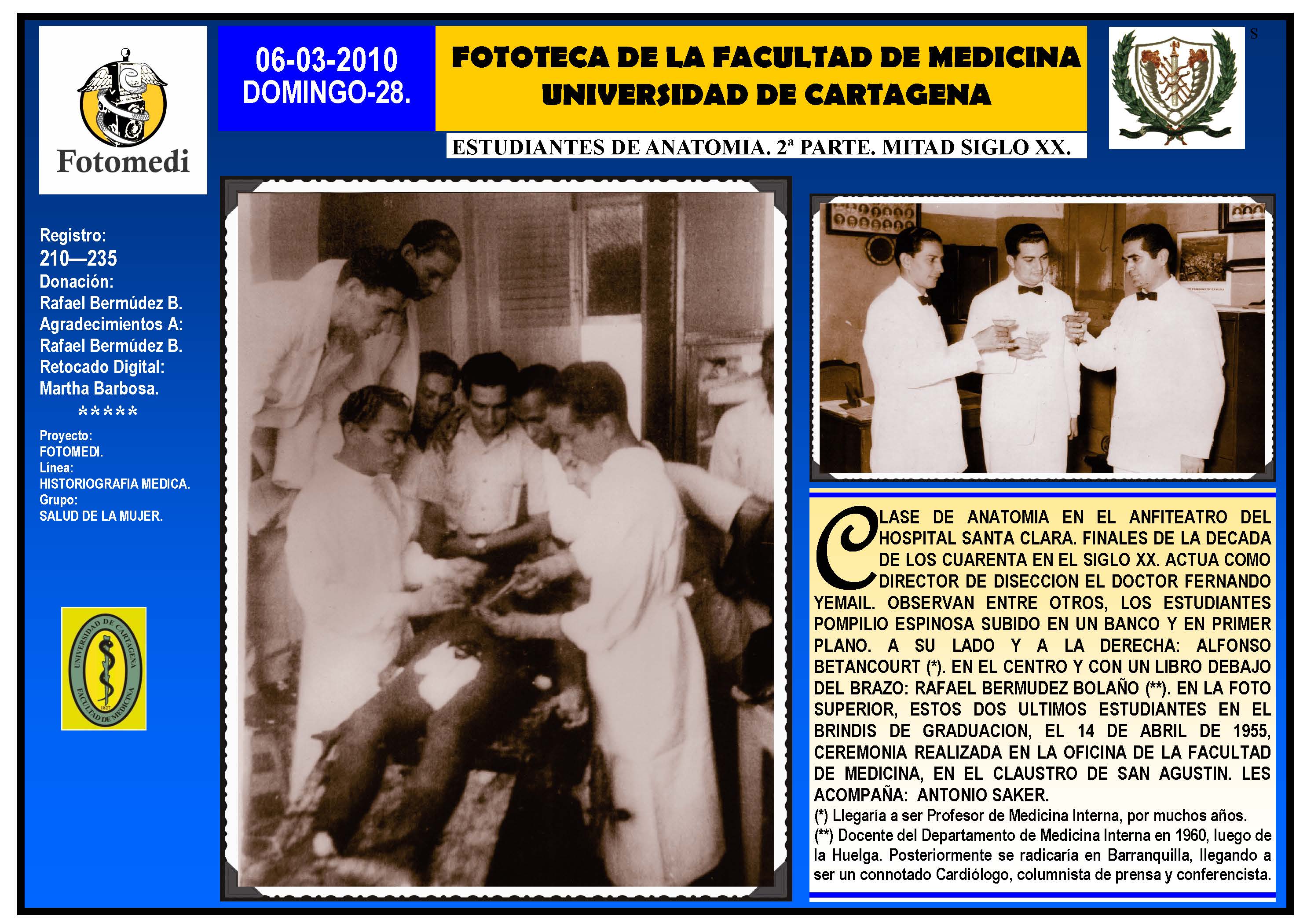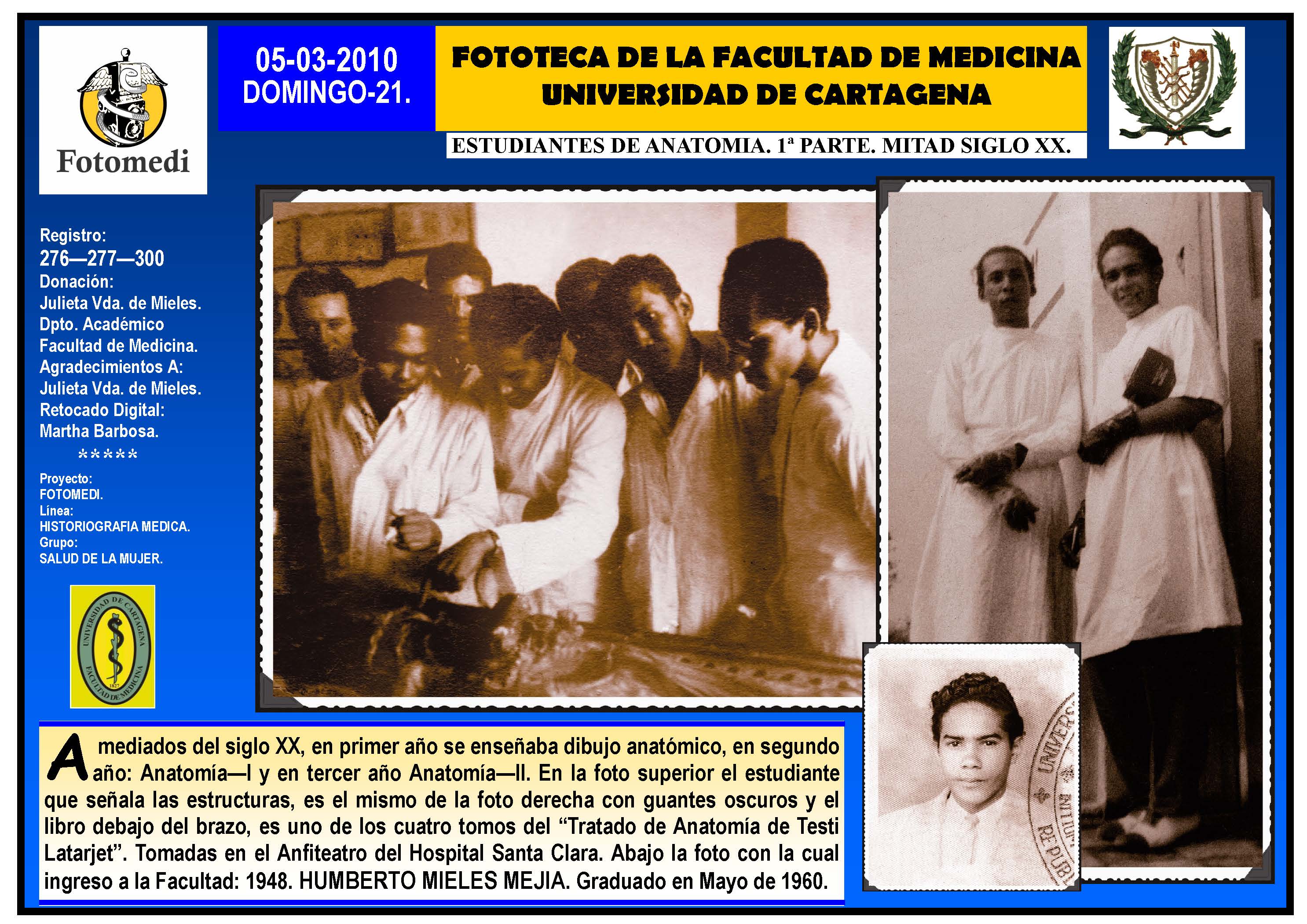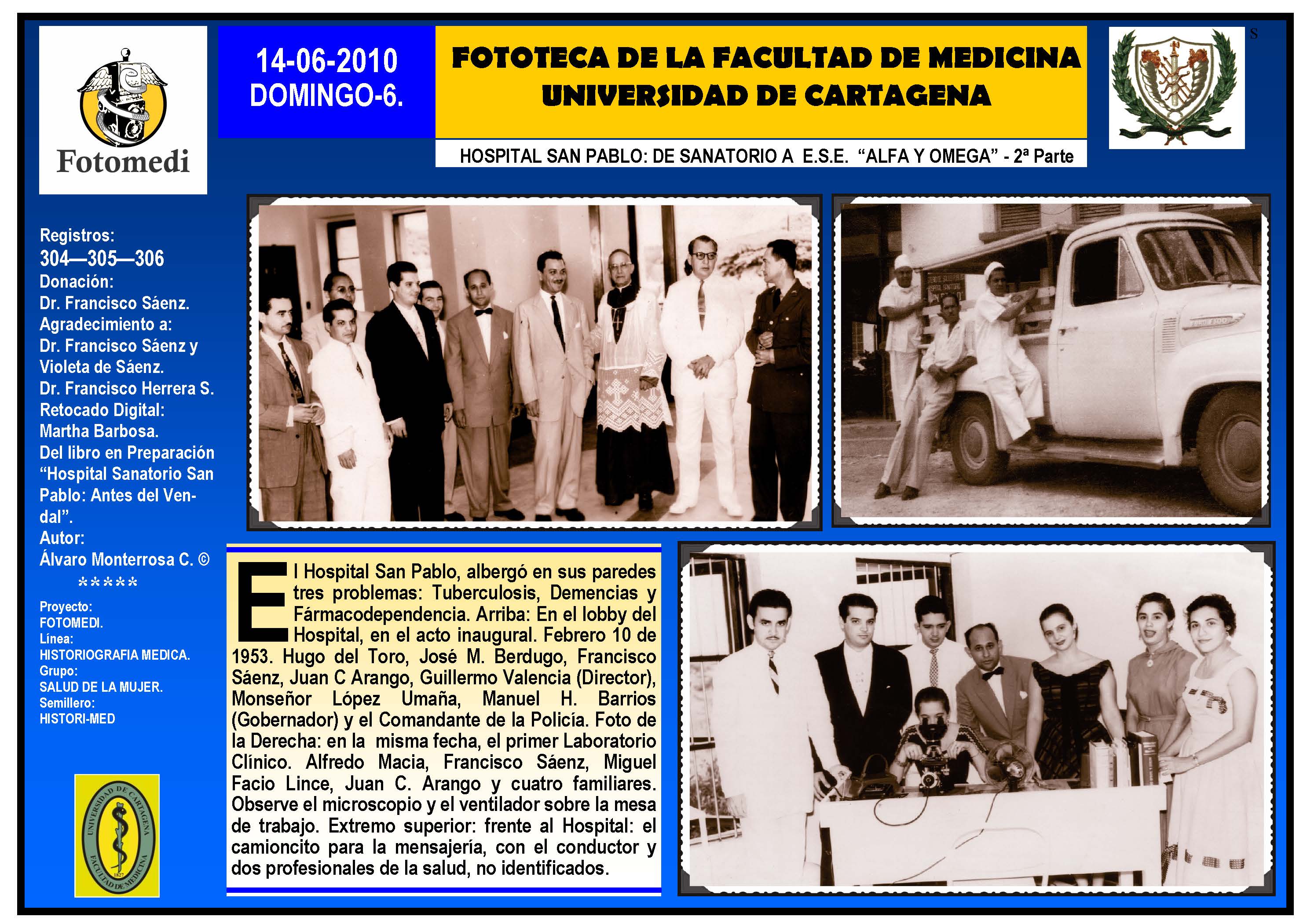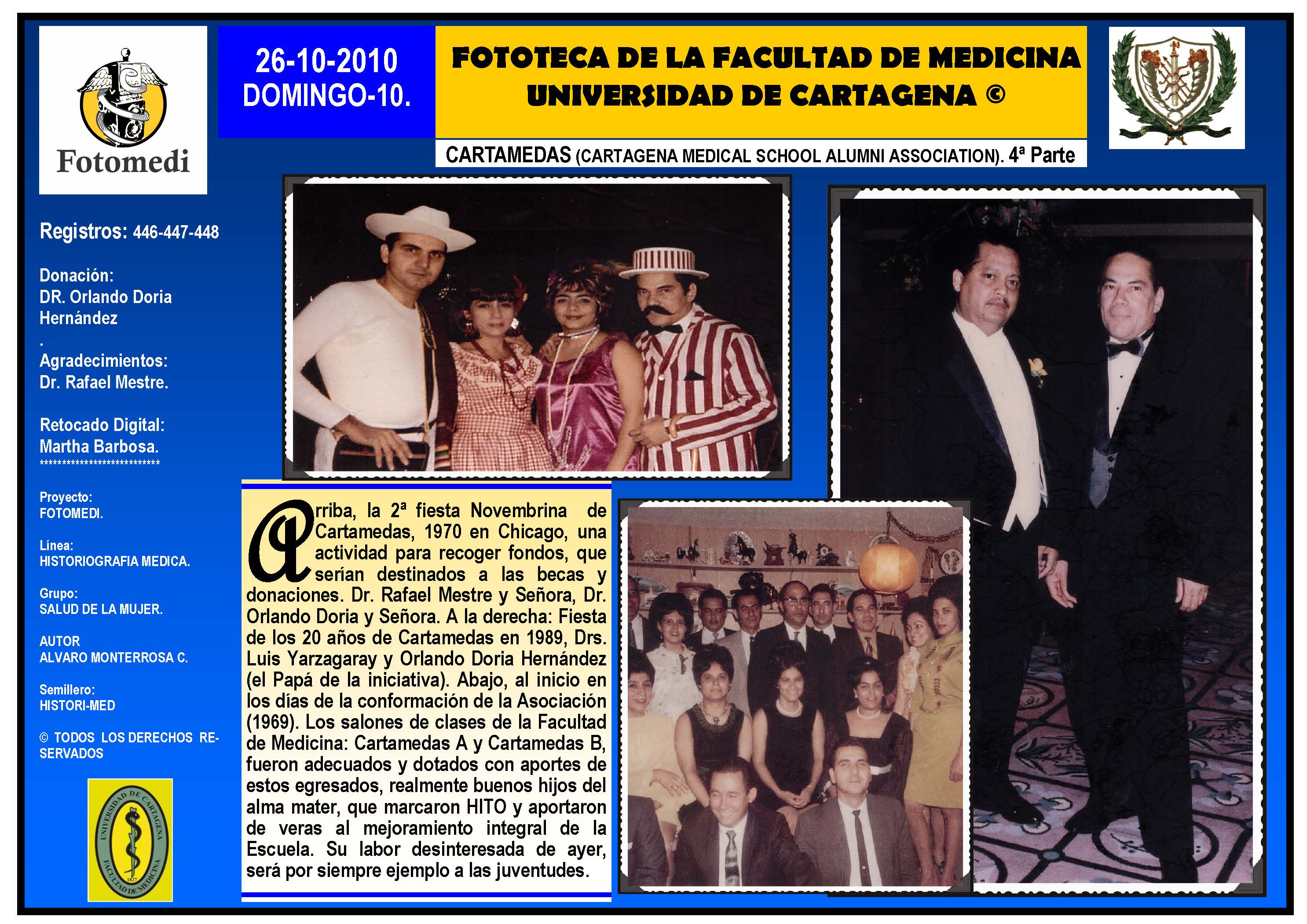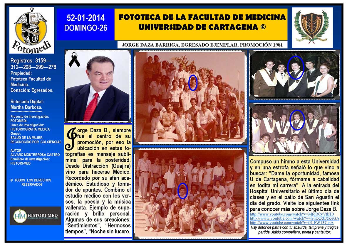 El proyecto FOTOMEDI se publicó en 55 entregas electrónicas por vía de email entre el 2010-2014 a profesionales médicos, egresados, administrativos y estudiantes de la Universidad de Cartagena, Colombia. Se presentaron más de 40 temáticas que abordaron aconteceres de la Escuela de Medicina de Dicha Universidad. El proyecto es periódicamente compartido completo o algunos de sus componente por redes sociales (Facebook, Instagram, Washapps y otras). Cada una de las entregas puede ser descargada libremente y compartida con fines estrictamente académicos, historiográficos o documentales, realizando la citación respectiva en cuanto a autorías y alojamiento en la web. No está autorizada la comercialización.