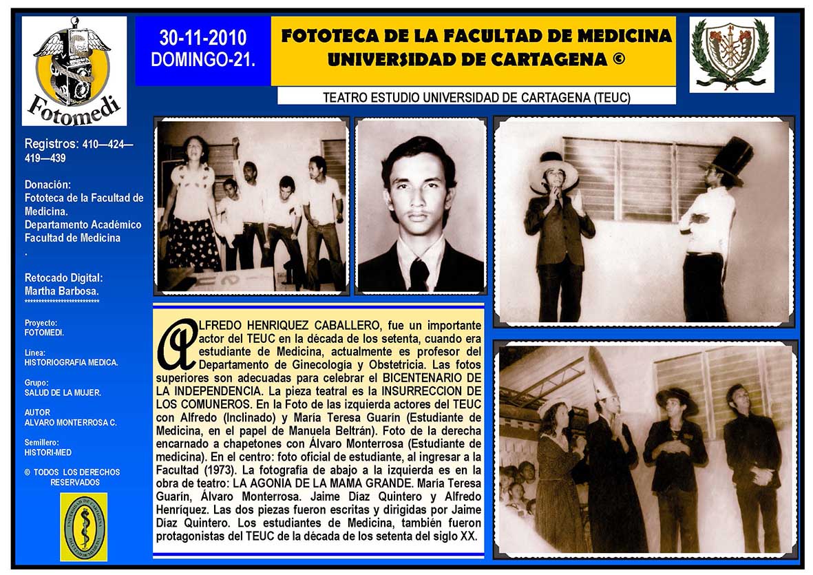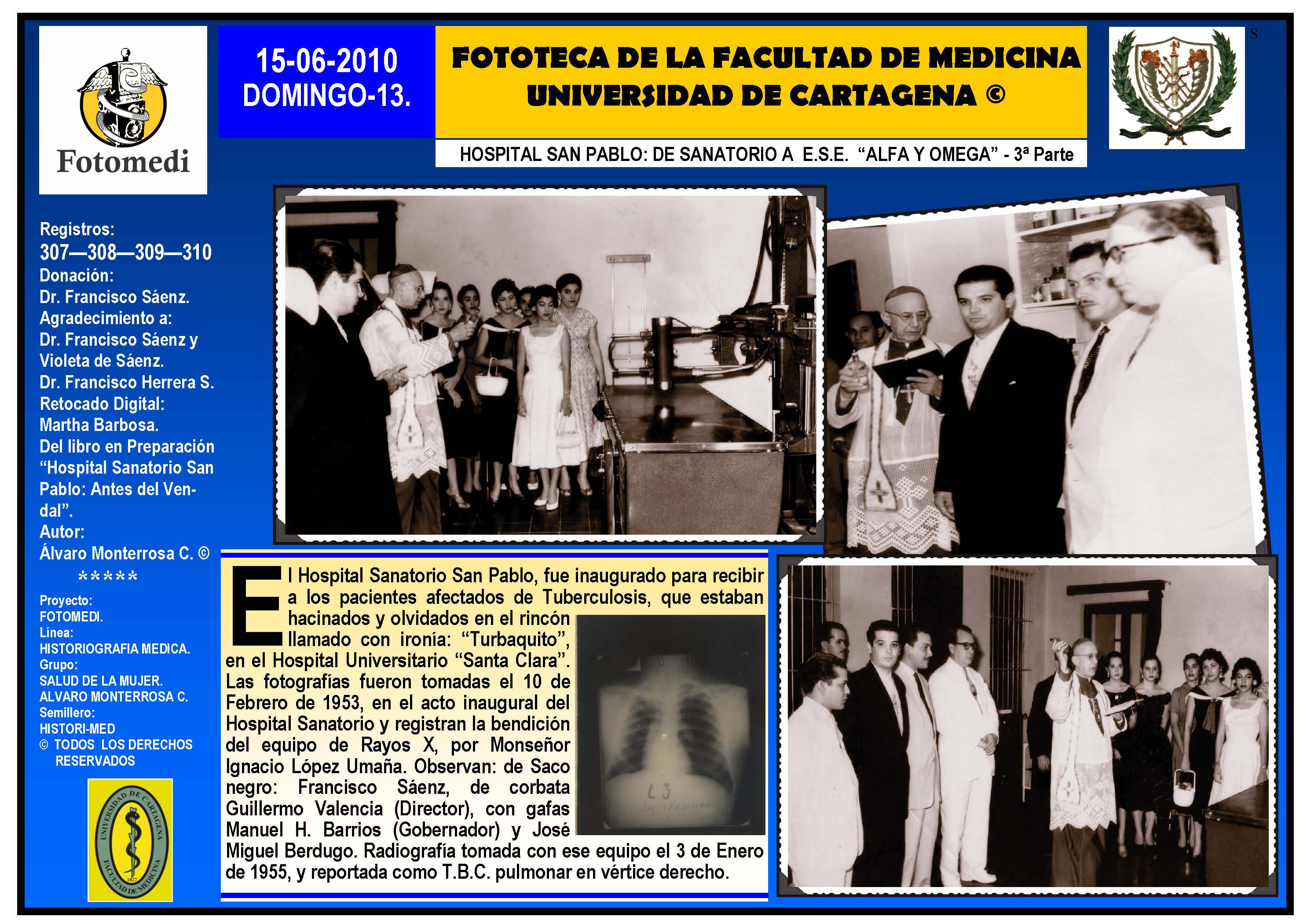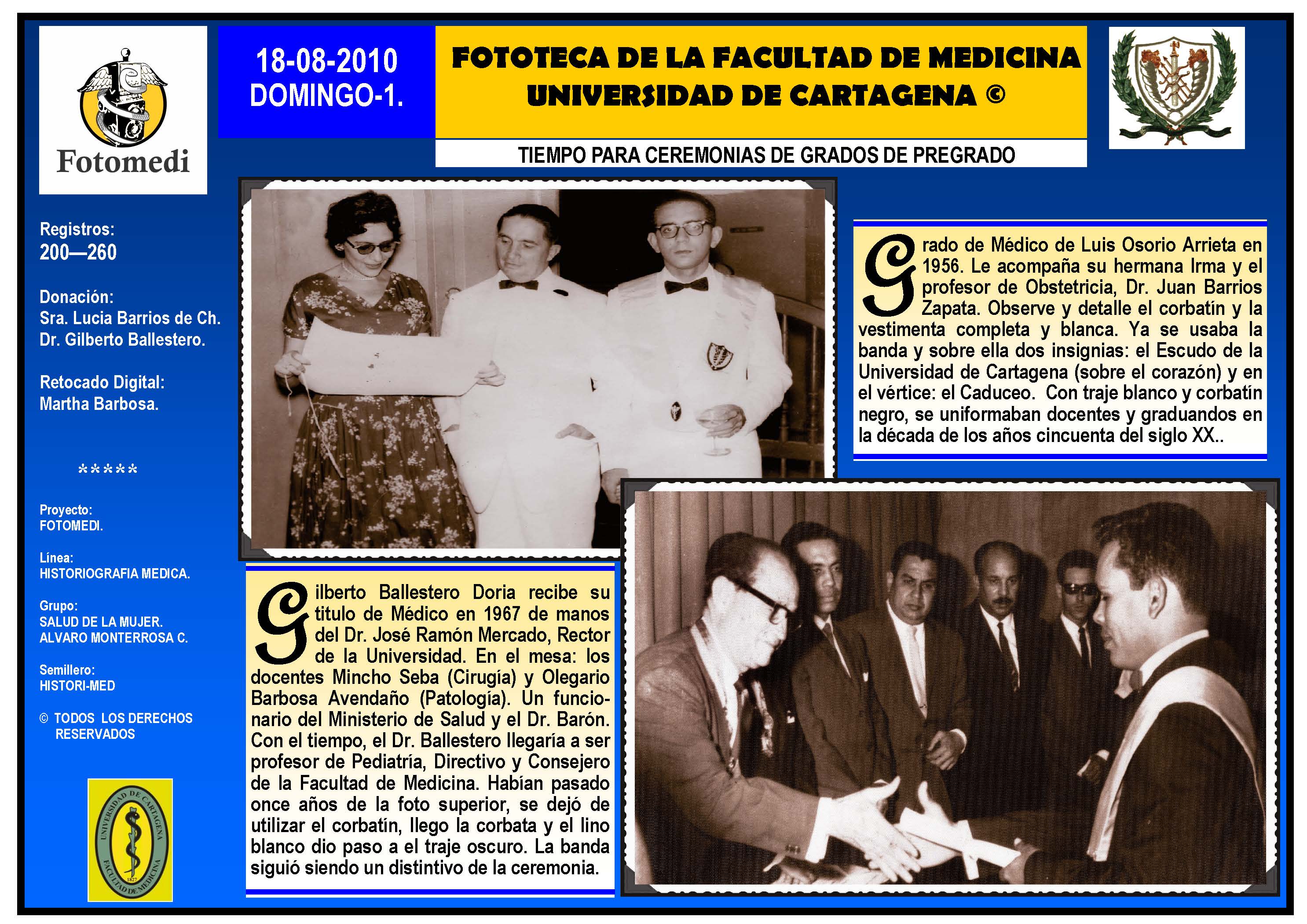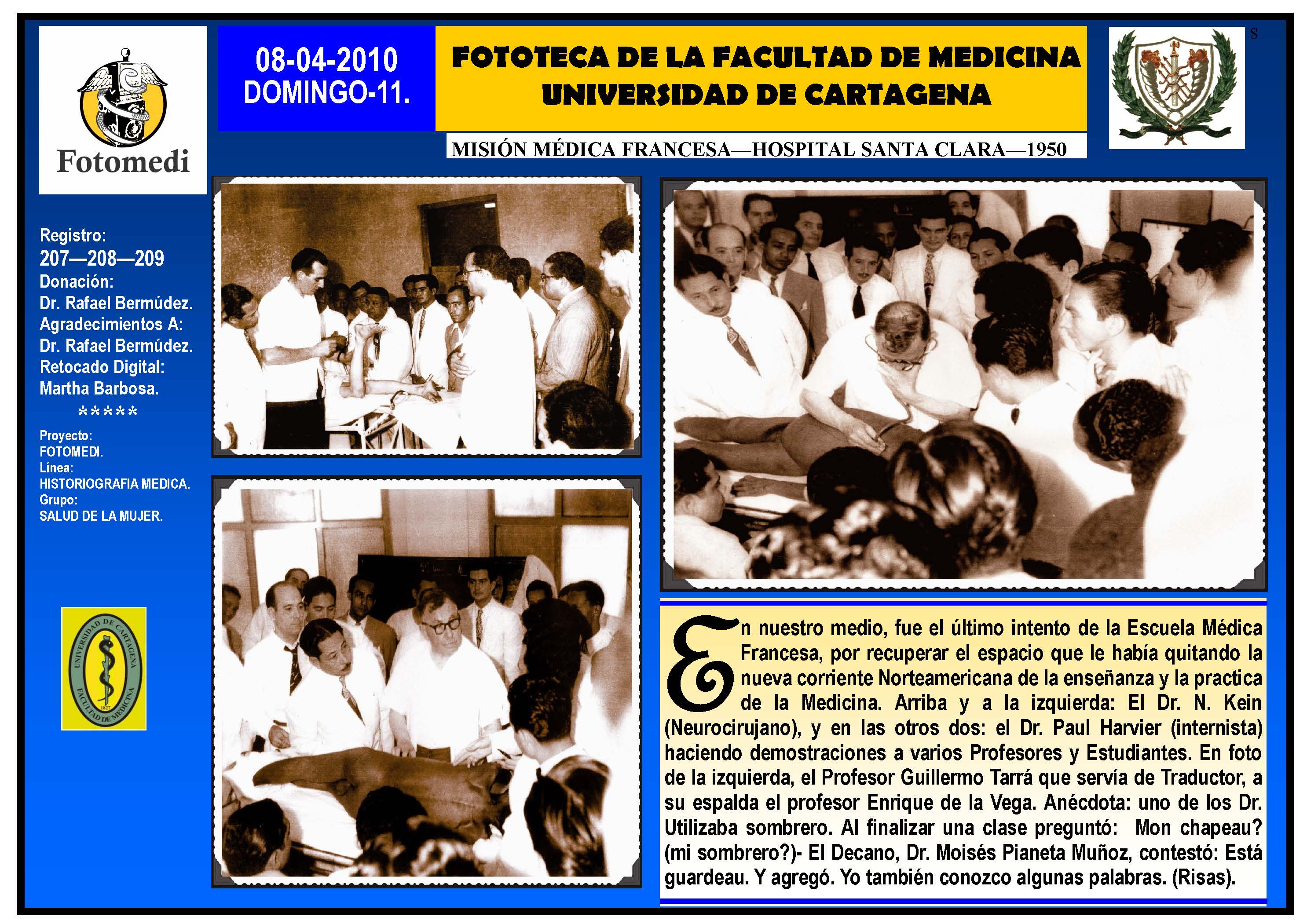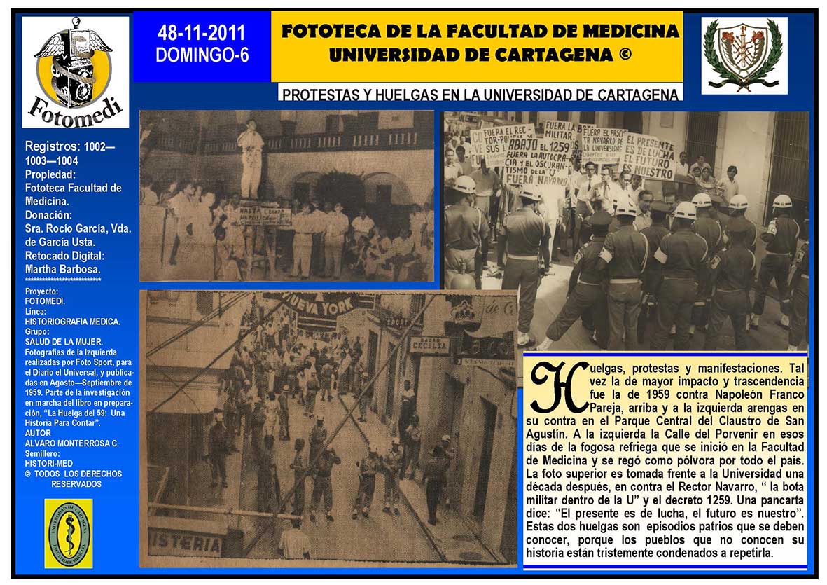 El proyecto FOTOMEDI se publicó en 55 entregas electrónicas por vía de email entre el 2010-2014 a profesionales médicos, egresados, administrativos y estudiantes de la Universidad de Cartagena, Colombia. Se presentaron más de 40 temáticas que abordaron aconteceres de la Escuela de Medicina de Dicha Universidad. El proyecto es periódicamente compartido completo o algunos de sus componente por redes sociales (Facebook, Instagram, Washapps y otras). Cada una de las entregas puede ser descargada libremente y compartida con fines estrictamente académicos, historiográficos o documentales, realizando la citación respectiva en cuanto a autorías y alojamiento en la web. No está autorizada la comercialización.