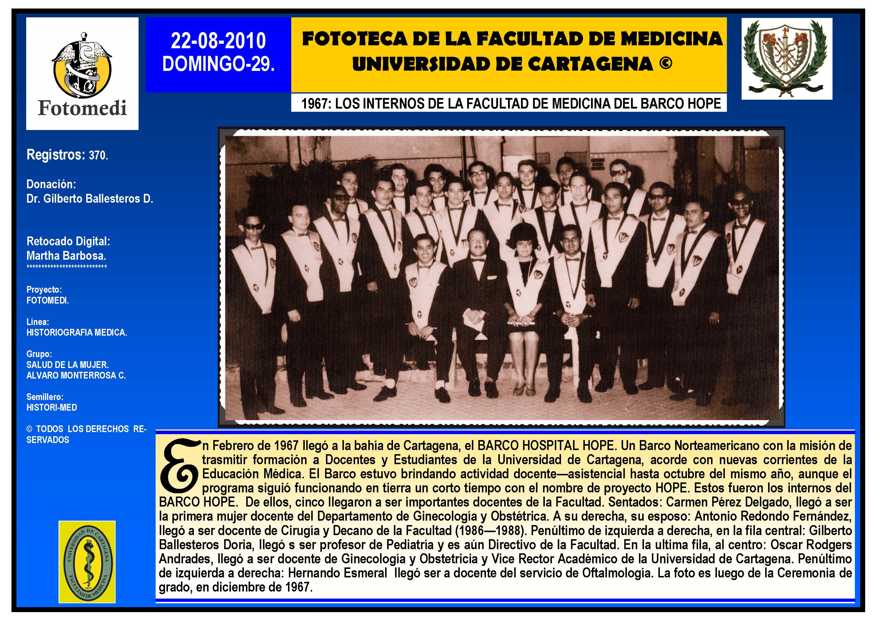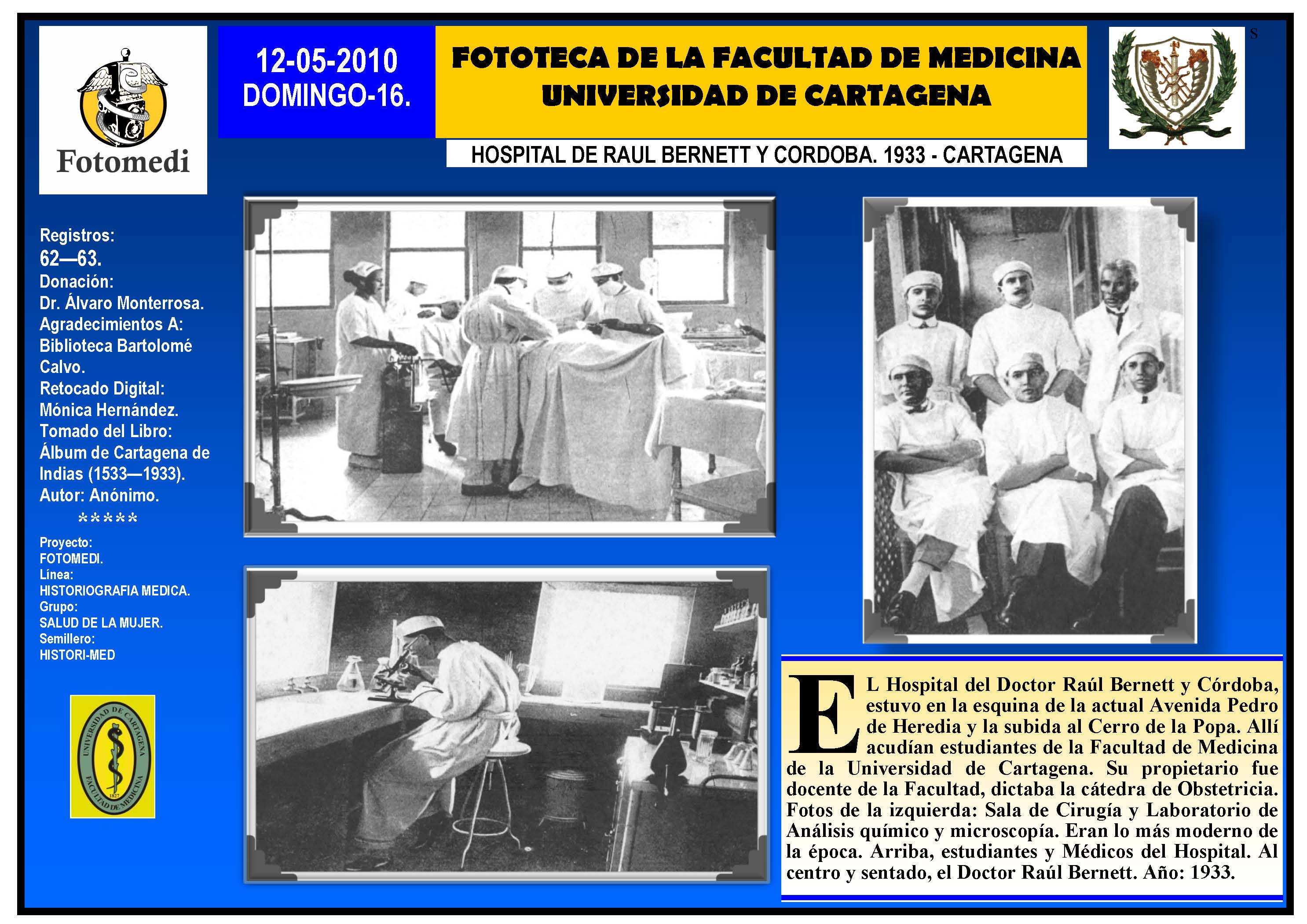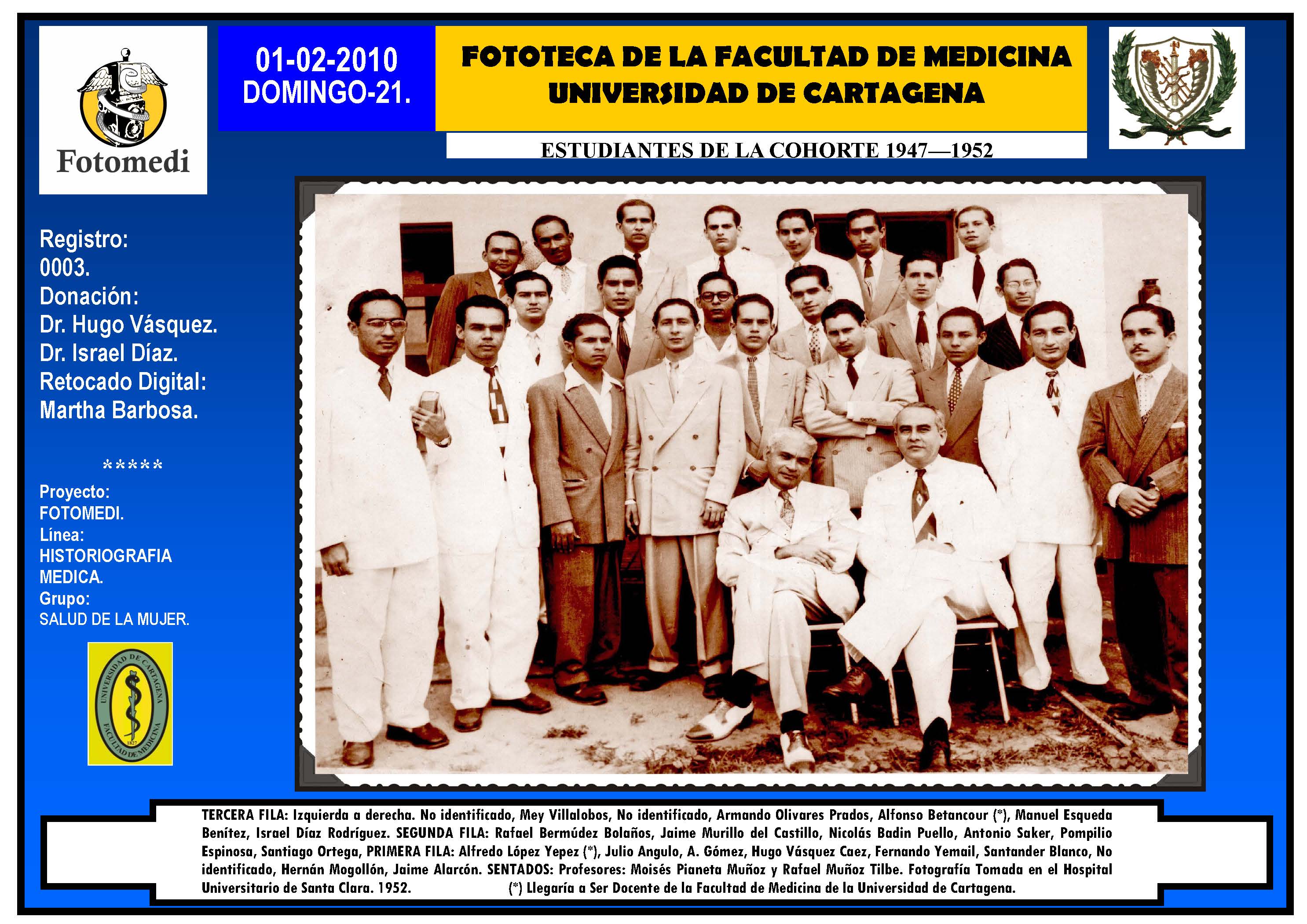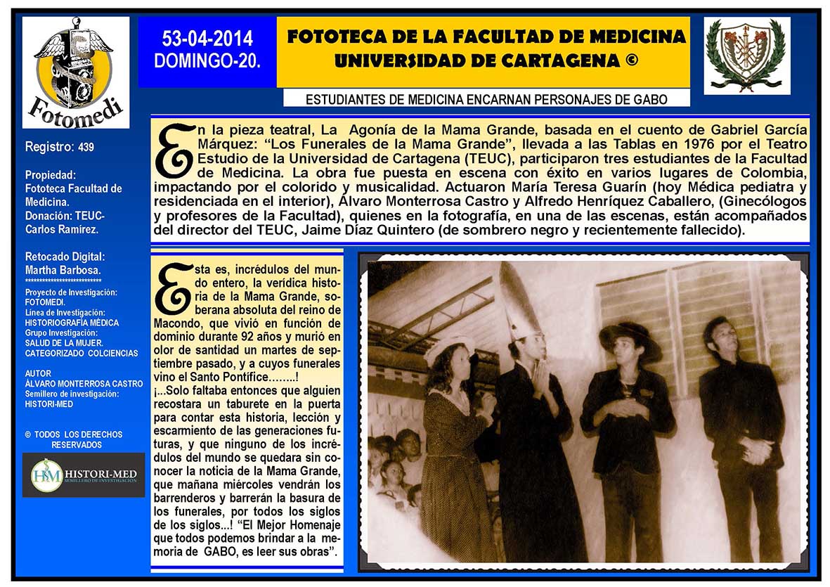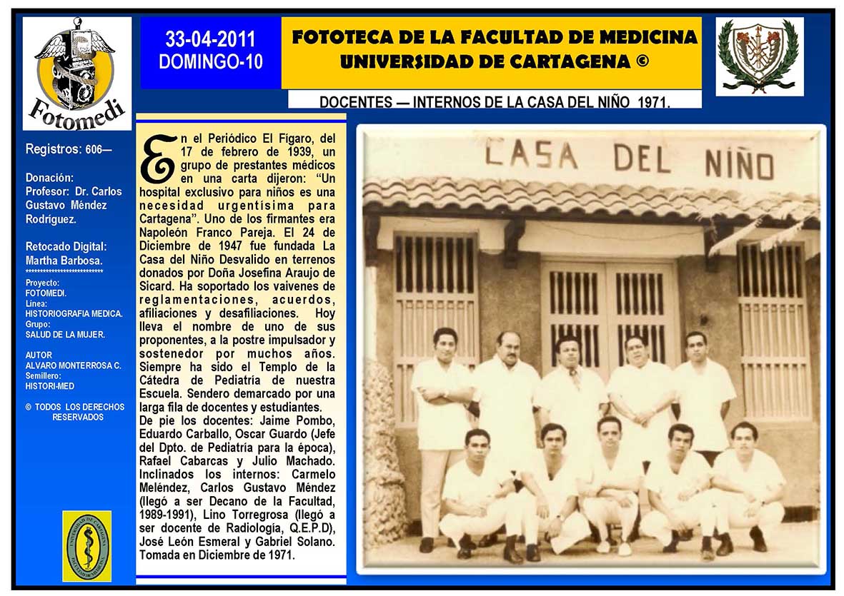 El proyecto FOTOMEDI se publicó en 55 entregas electrónicas por vía de email entre el 2010-2014 a profesionales médicos, egresados, administrativos y estudiantes de la Universidad de Cartagena, Colombia. Se presentaron más de 40 temáticas que abordaron aconteceres de la Escuela de Medicina de Dicha Universidad. El proyecto es periódicamente compartido completo o algunos de sus componente por redes sociales (Facebook, Instagram, Washapps y otras). Cada una de las entregas puede ser descargada libremente y compartida con fines estrictamente académicos, historiográficos o documentales, realizando la citación respectiva en cuanto a autorías y alojamiento en la web. No está autorizada la comercialización.