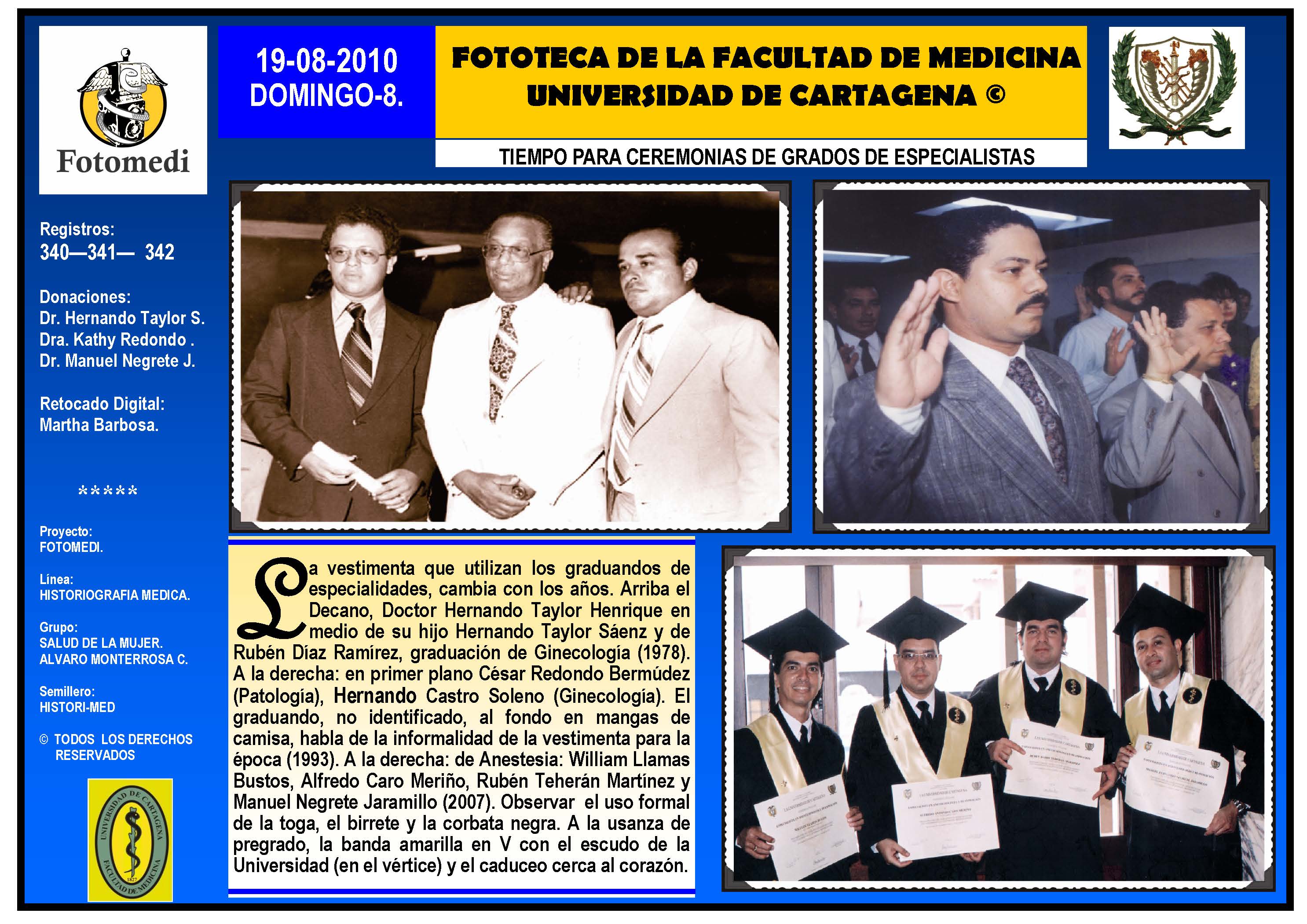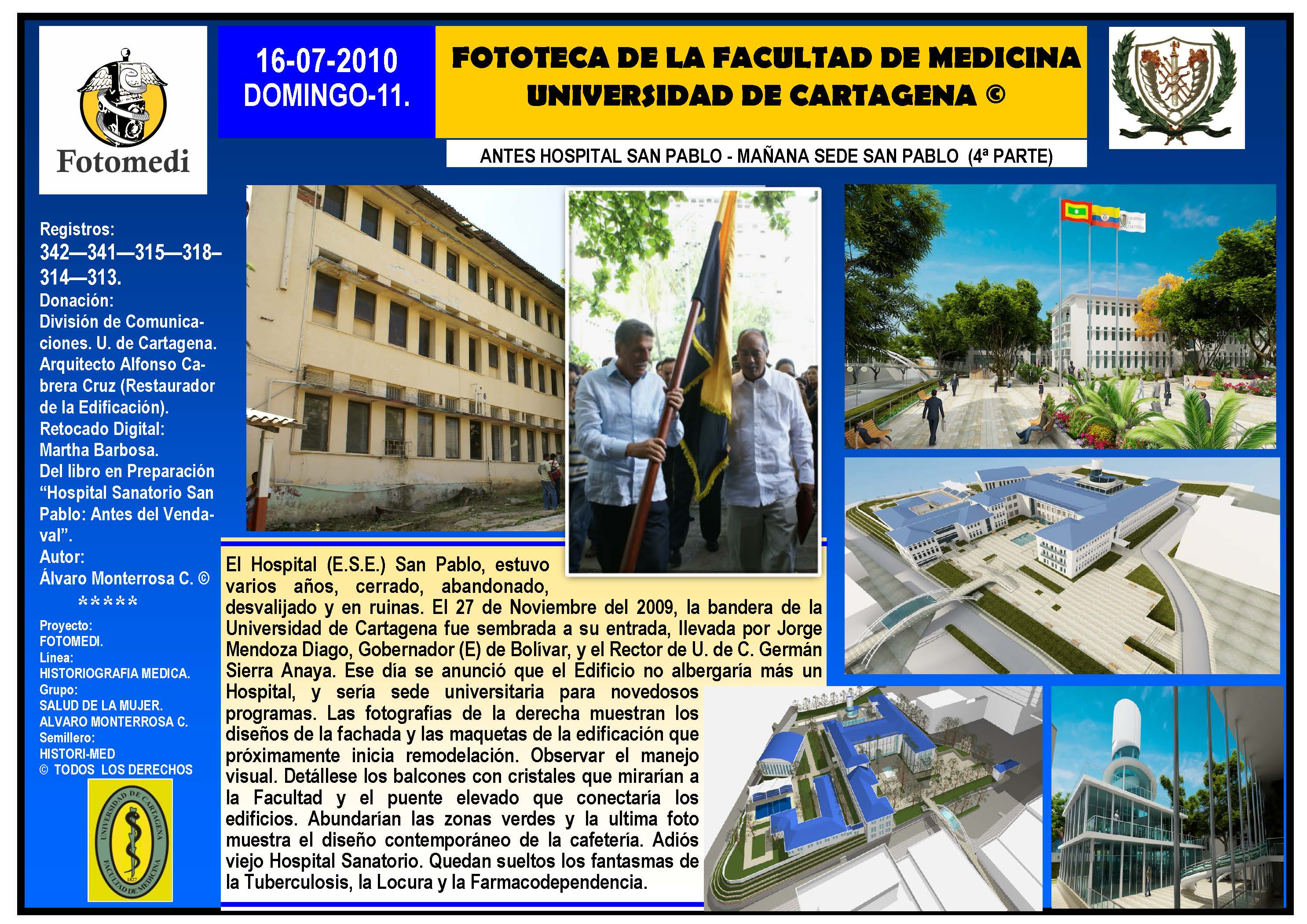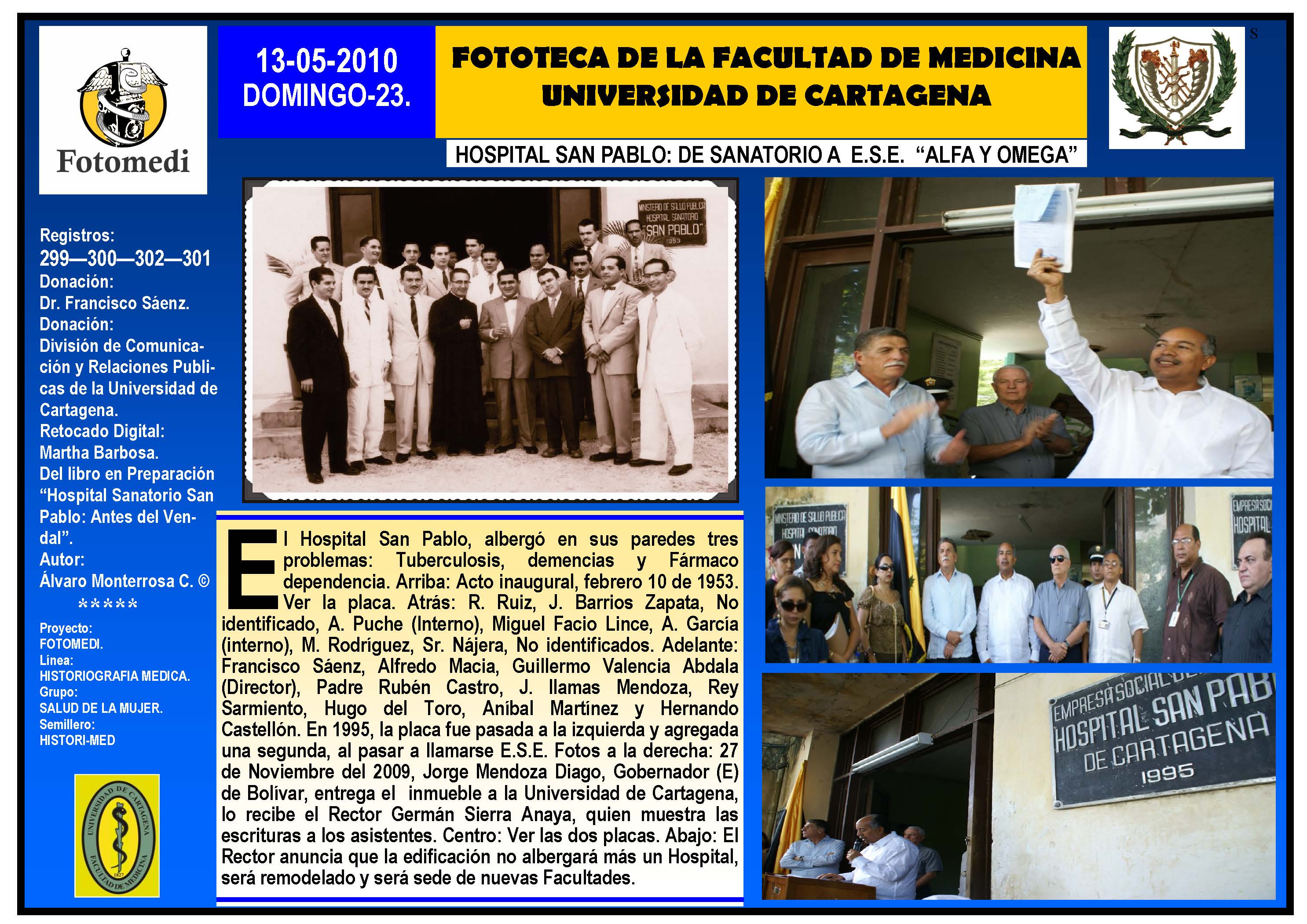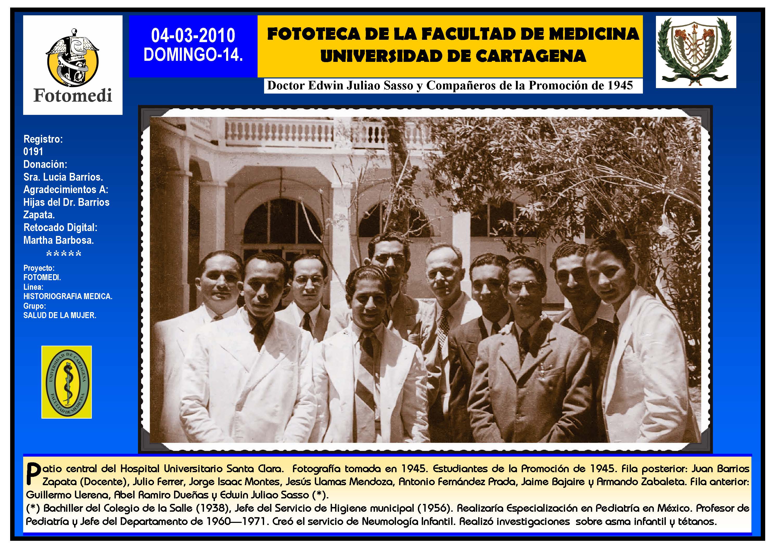 El proyecto FOTOMEDI se publicó en 55 entregas electrónicas por vía de email entre el 2010-2014 a profesionales médicos, egresados, administrativos y estudiantes de la Universidad de Cartagena, Colombia. Se presentaron más de 40 temáticas que abordaron aconteceres de la Escuela de Medicina de Dicha Universidad. El proyecto es periódicamente compartido completo o algunos de sus componente por redes sociales (Facebook, Instagram, Washapps y otras). Cada una de las entregas puede ser descargada libremente y compartida con fines estrictamente académicos, historiográficos o documentales, realizando la citación respectiva en cuanto a autorías y alojamiento en la web. No está autorizada la comercialización.