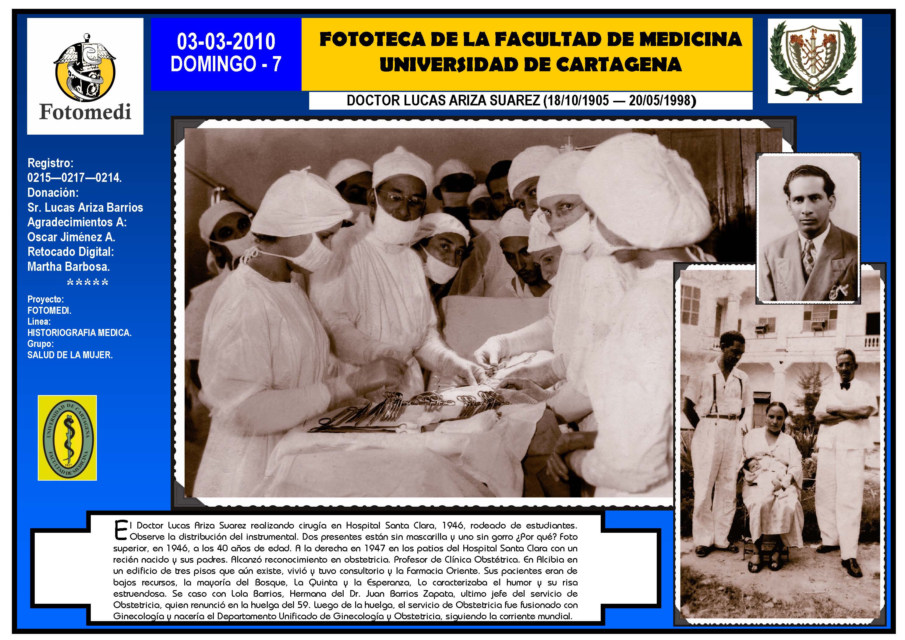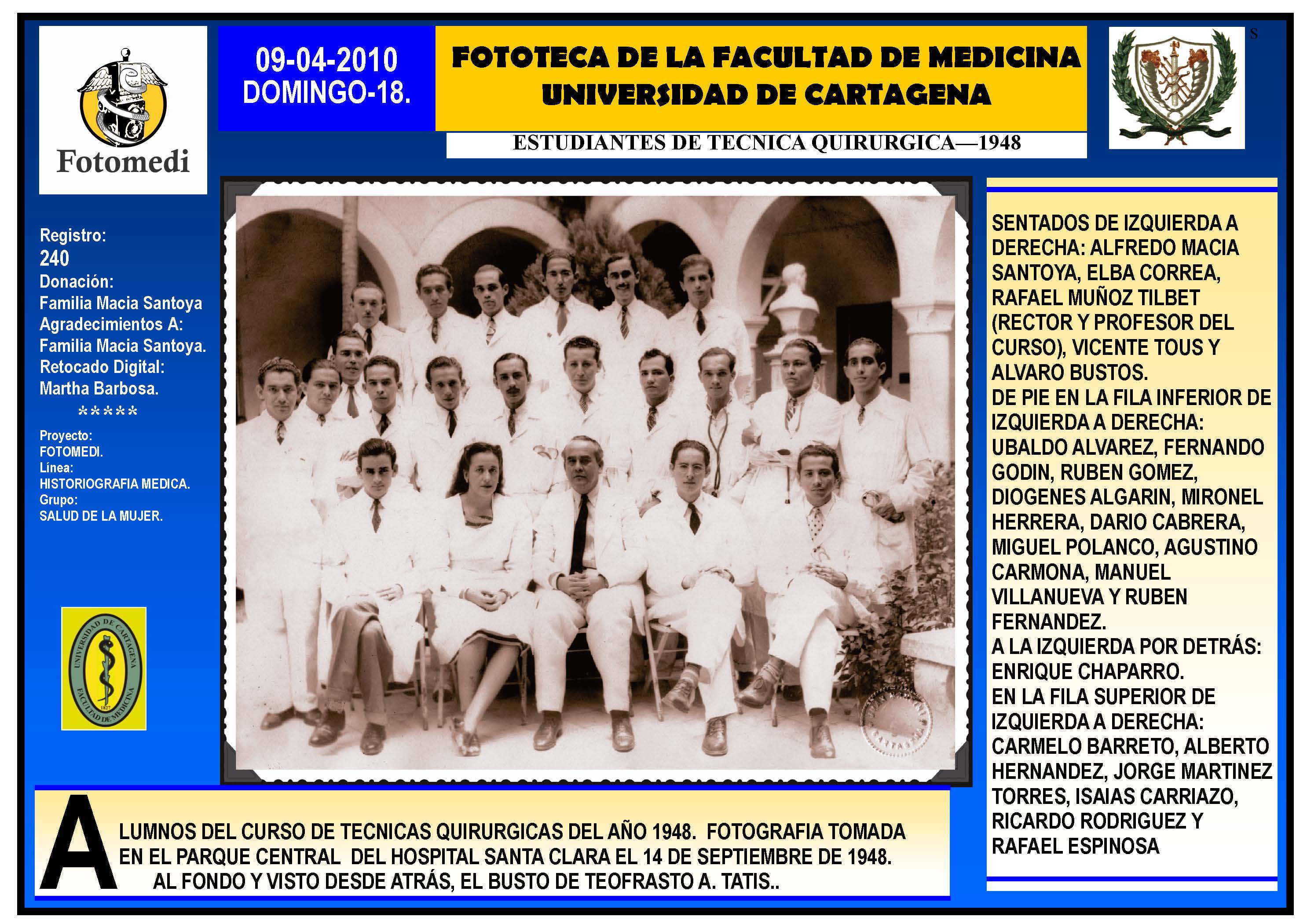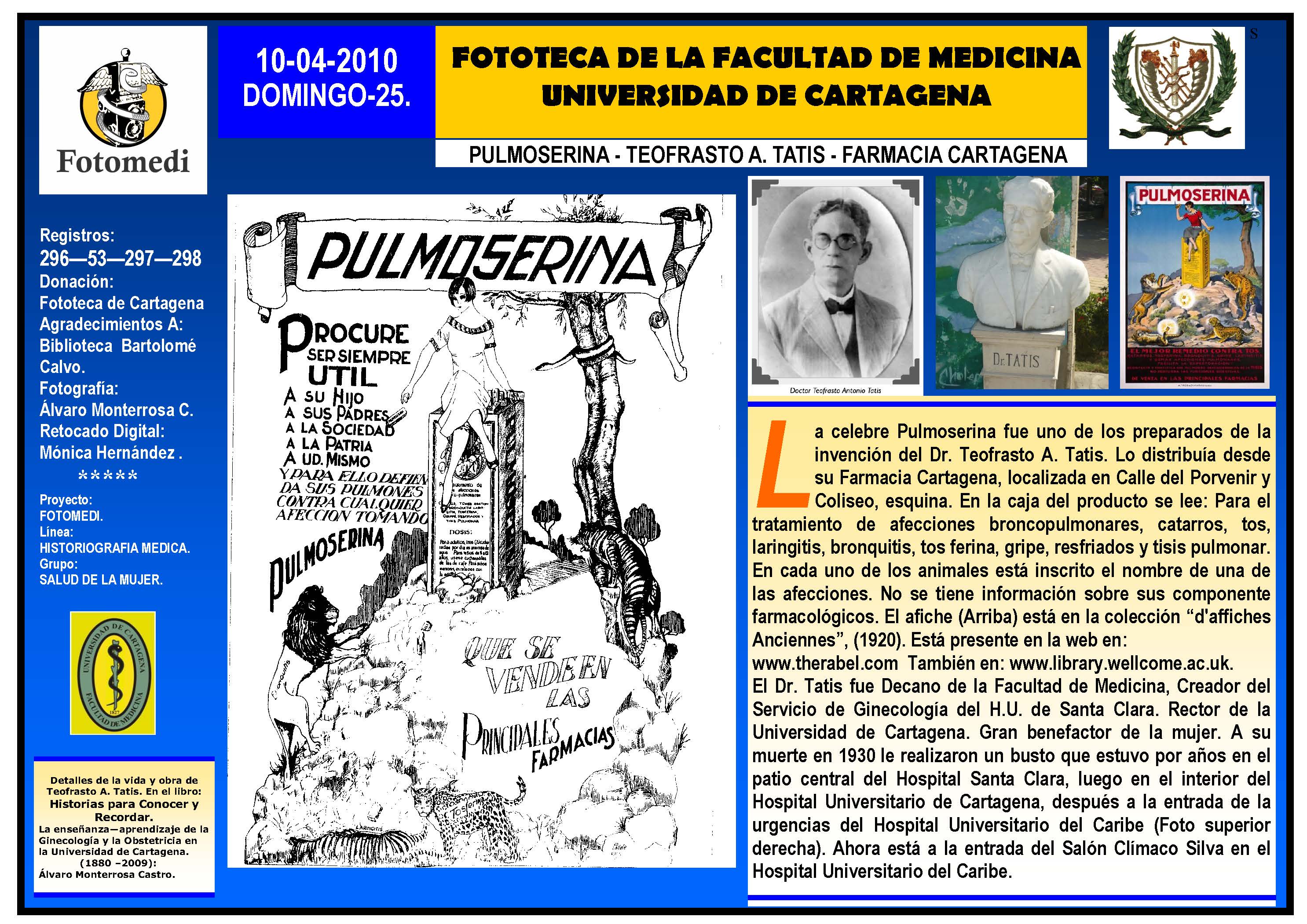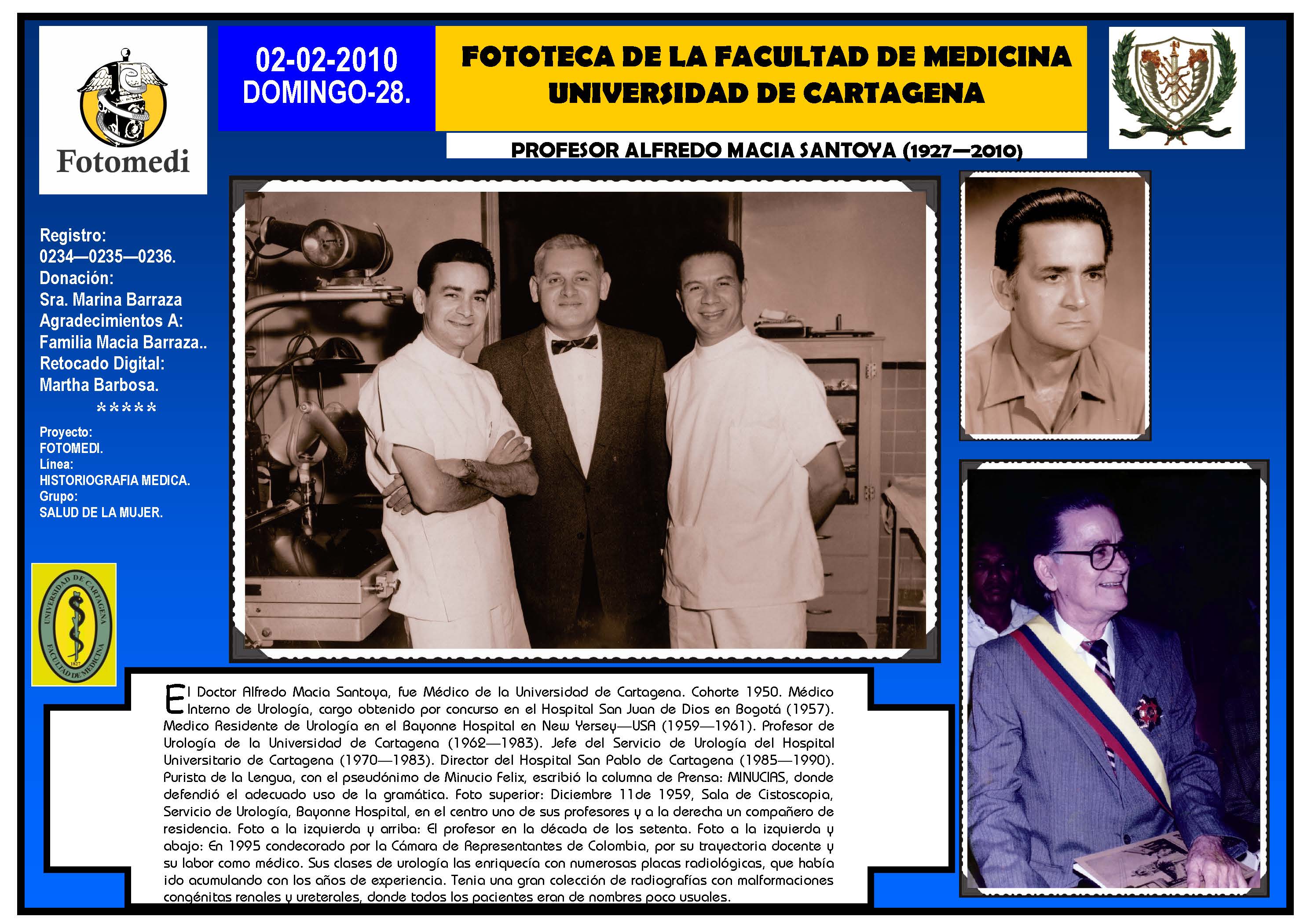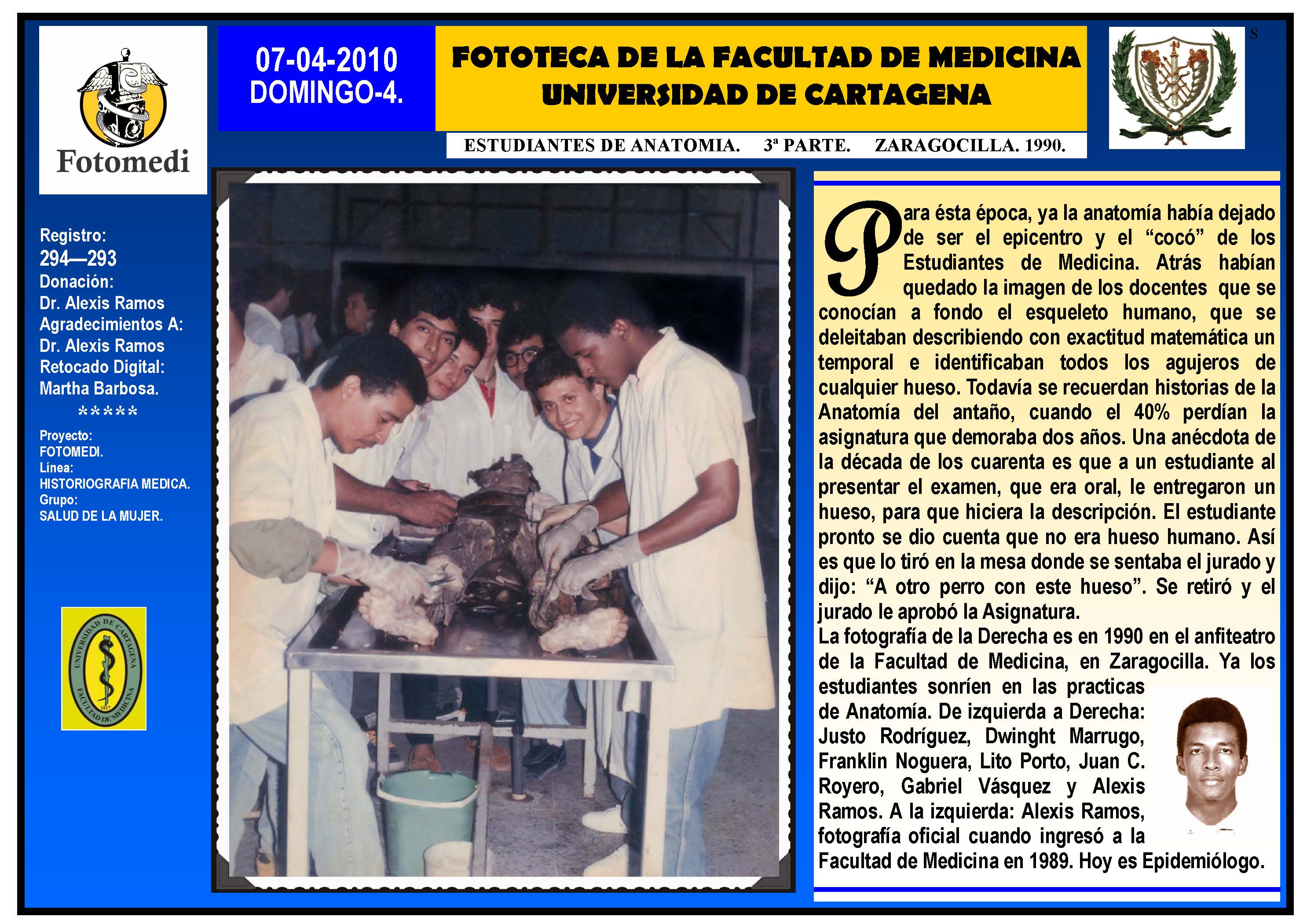 El proyecto FOTOMEDI se publicó en 55 entregas electrónicas por vía de email entre el 2010-2014 a profesionales médicos, egresados, administrativos y estudiantes de la Universidad de Cartagena, Colombia. Se presentaron más de 40 temáticas que abordaron aconteceres de la Escuela de Medicina de Dicha Universidad. El proyecto es periódicamente compartido completo o algunos de sus componente por redes sociales (Facebook, Instagram, Washapps y otras). Cada una de las entregas puede ser descargada libremente y compartida con fines estrictamente académicos, historiográficos o documentales, realizando la citación respectiva en cuanto a autorías y alojamiento en la web. No está autorizada la comercialización.
